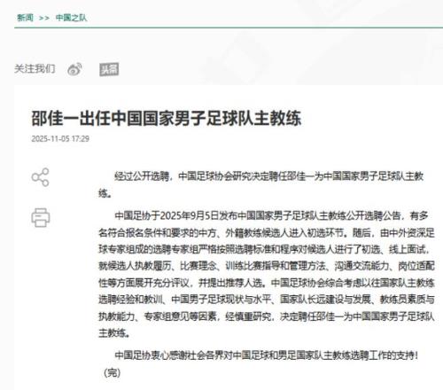 足协在昨天的官方公告中表示,综合考虑以往国家队主教练选聘经验和教训、中国男子足球现状与水平、国家队长远建设与发展、教练员素质与执教能力、专家组意见等因素,经慎重研究,决定聘任邵佳一为中国国家男子足球队主教练。